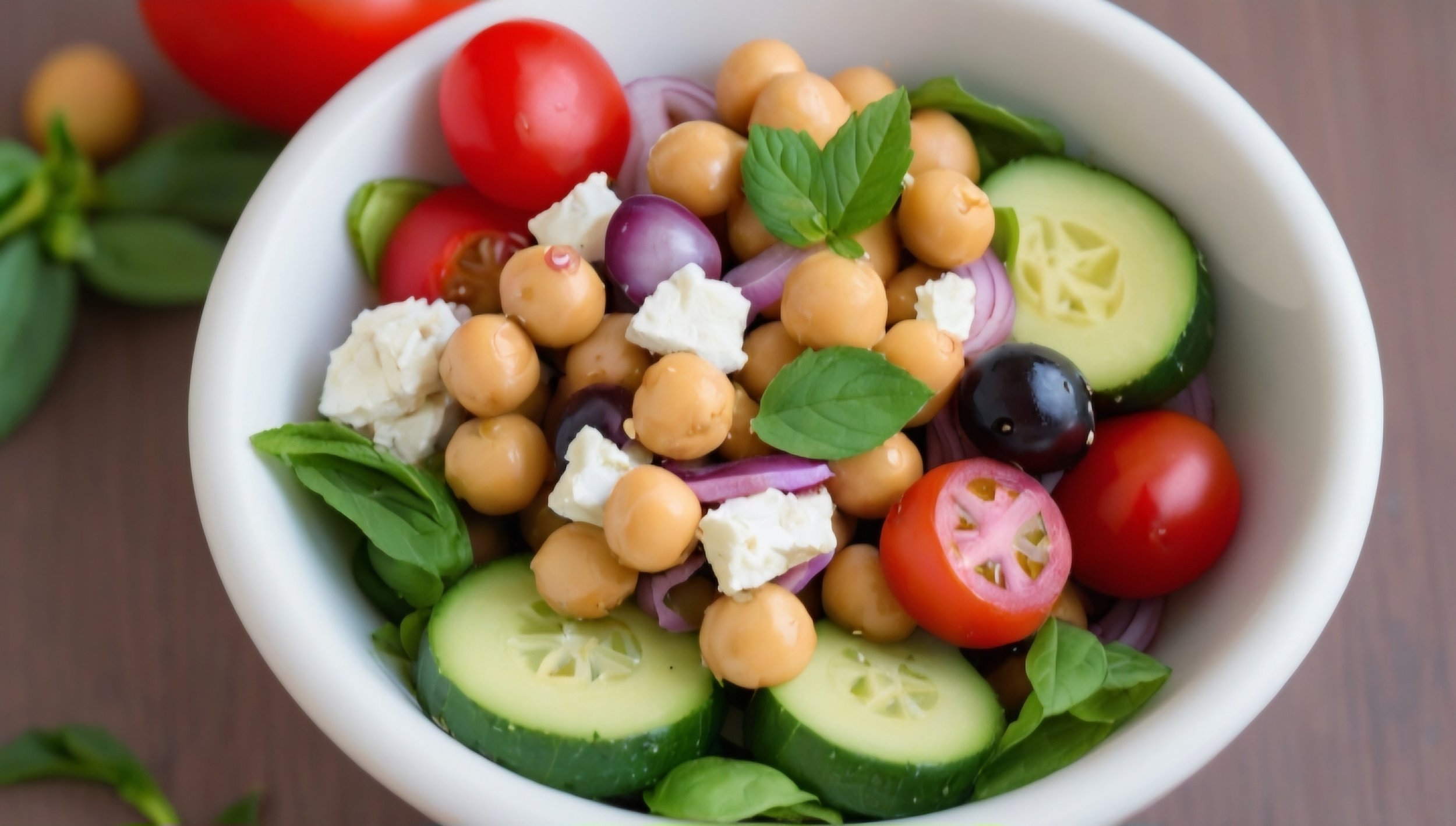 - Mediterranean Chickpea Salad: Chickpeas, cucumber, cherry tomatoes, red onion, olives, and feta cheese tossed in a lemon-herb dressing.
